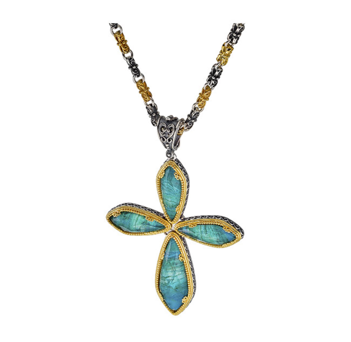 Εντυπωσιακός σταυρός από ασήμι 925 με πολυτελή επιχρύσωση, διακοσμημένος με φυσικούς λίθους Αζουρίτη σε μοναδική μπλε-πράσινη απόχρωση. Το χειροποίητο πλαίσιο με χρυσές λεπτομέρειες αναδεικνύει τις πέτρες, δημιουργώντας ένα ιδιαίτερο και κομψό κόσμημα. Η αλυσίδα ακολουθεί το ίδιο περίτεχνο ύφος, με συνδυασμό ασημένιων και επιχρυσωμένων στοιχείων.