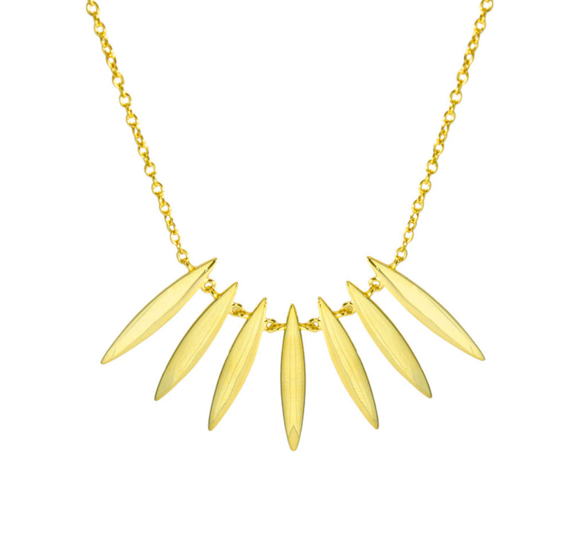 Ένα μοντέρνο και φωτεινό κόσμημα, σχεδιασμένο για τη γυναίκα που αγαπά τη μίνιμαλ κομψότητα. Το κολιέ αποτελείται από επτά επιμήκη στοιχεία, κατασκευασμένα από ασήμι 925 και επιχρυσωμένα με 24 καράτια χρυσό, τα οποία αιωρούνται ελεύθερα πάνω στην αλυσίδα, δημιουργώντας έντονη λάμψη και κίνηση.