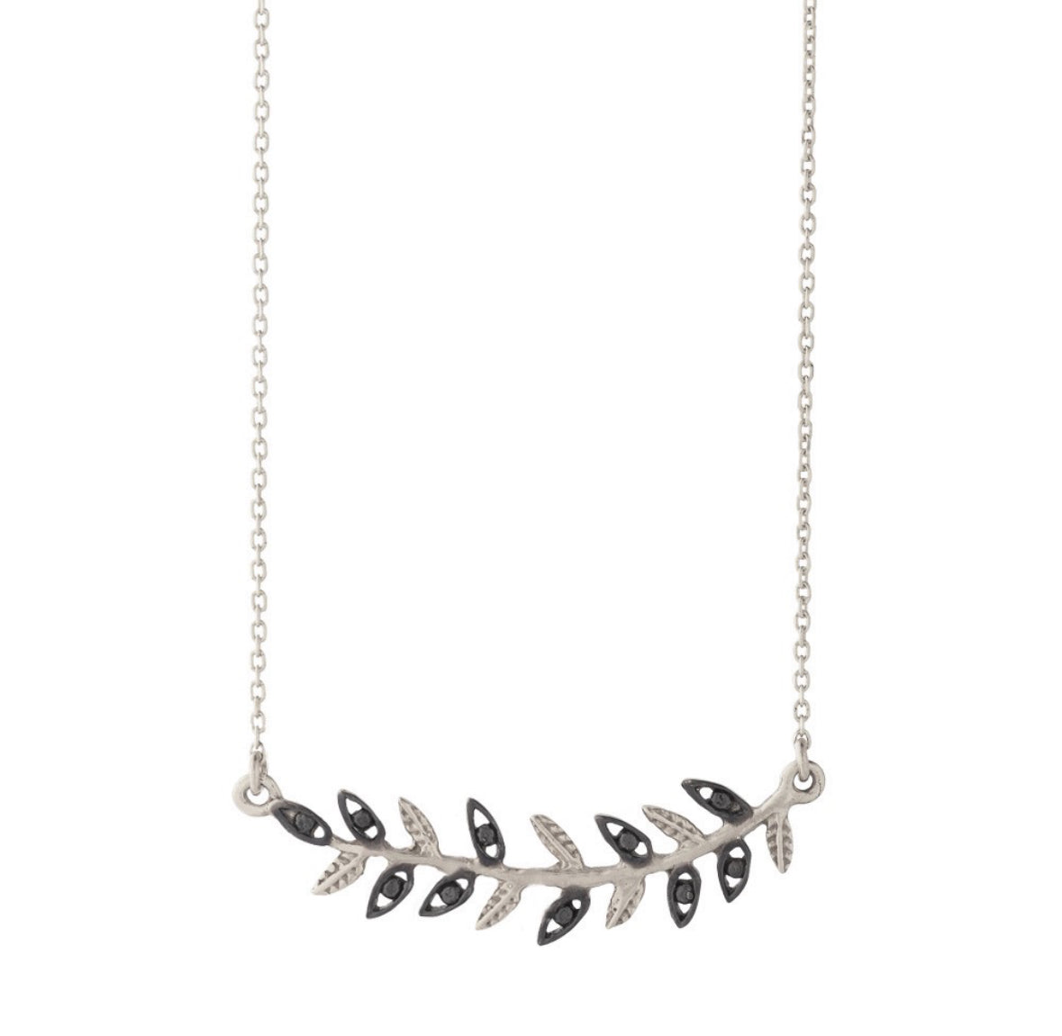 Κομψό και διαχρονικό κολιέ από ασήμι 925 με μοτίβο κλαδί ελιάς, σύμβολο ειρήνης, γονιμότητας και σοφίας. Οι λεπτομέρειες σε μαύρο ρόδιο αναδεικνύουν με αρμονία το φυσικό σχήμα των φύλλων, προσθέτοντας μια μοντέρνα πινελιά σε ένα παραδοσιακό ελληνικό σύμβολο.