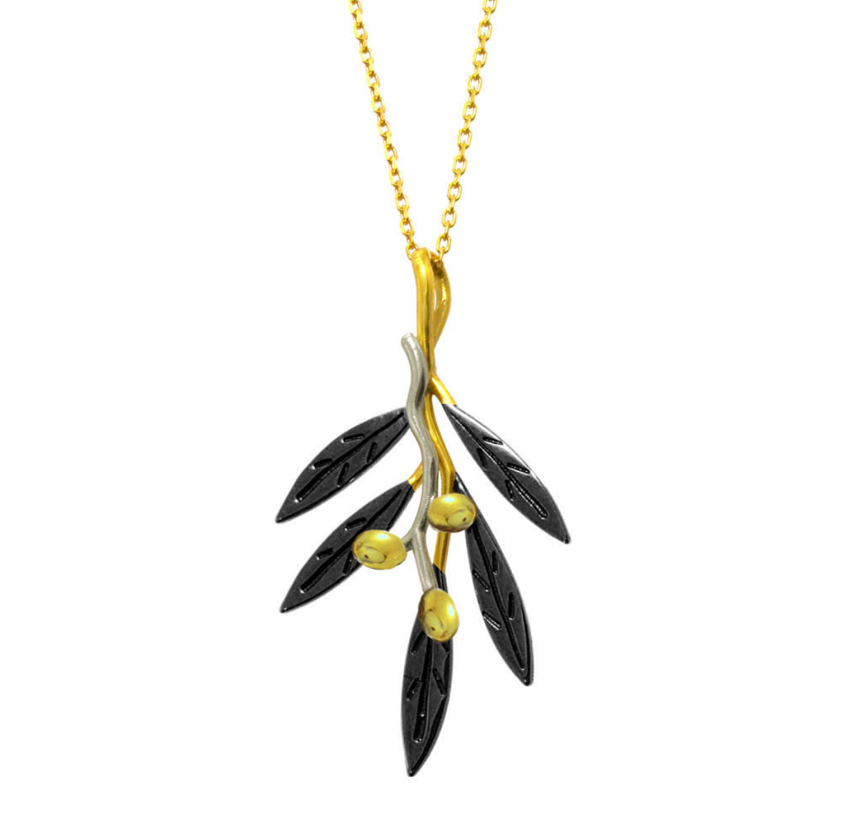 Εμπνευσμένο από την ομορφιά και τον συμβολισμό της ελληνικής φύσης, αυτό το κολιέ από ασήμι 925 απεικονίζει ένα κομψό κλαδί ελιάς με λεπτομέρειες σε μαύρο ρόδιο και επιχρυσωμένες ελιές 24Κ. Ο μοναδικός συνδυασμός χρωμάτων — χρυσού, ασημί και μαύρου — χαρίζει στο κόσμημα έναν ξεχωριστό χαρακτήρα, ιδανικό για κάθε περίσταση.