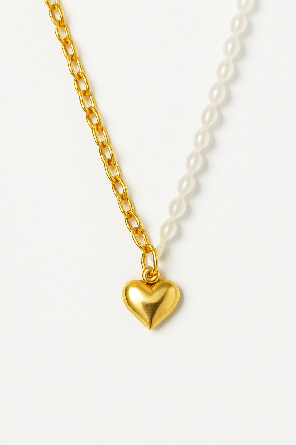 Ένα διακριτικό και θηλυκό κολιέ, ιδανικό για καθημερινή κομψότητα. Κατασκευασμένο από επιχρυσωμένο ασήμι 925 , διαθέτει μια λεπτή και ανάλαφρη αλυσίδα που καταλήγει σε ένα μικροσκοπικό, γυαλιστερό επίχρυσο μοτίφ καρδιάς Η επιχρυσωμένη αλυσίδα συνδέεται αρμονικά με μια σειρά από μικρά λευκά μαργαριταράκια, δημιουργώντας μια υπέροχη διχρωμία υφής και λάμψης.