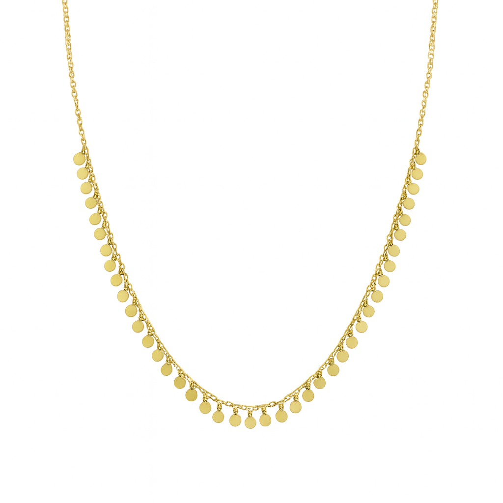 Ένα κομψό και διαχρονικό κολιέ σε χρυσή απόχρωση, διακοσμημένο με μικρούς κρεμαστούς δίσκους που χαρίζουν κίνηση και λάμψη σε κάθε εμφάνιση. Ιδανικό για να φορεθεί μόνο του ως statement piece ή σε layering με άλλα κολιέ για πιο μοντέρνο στυλ.