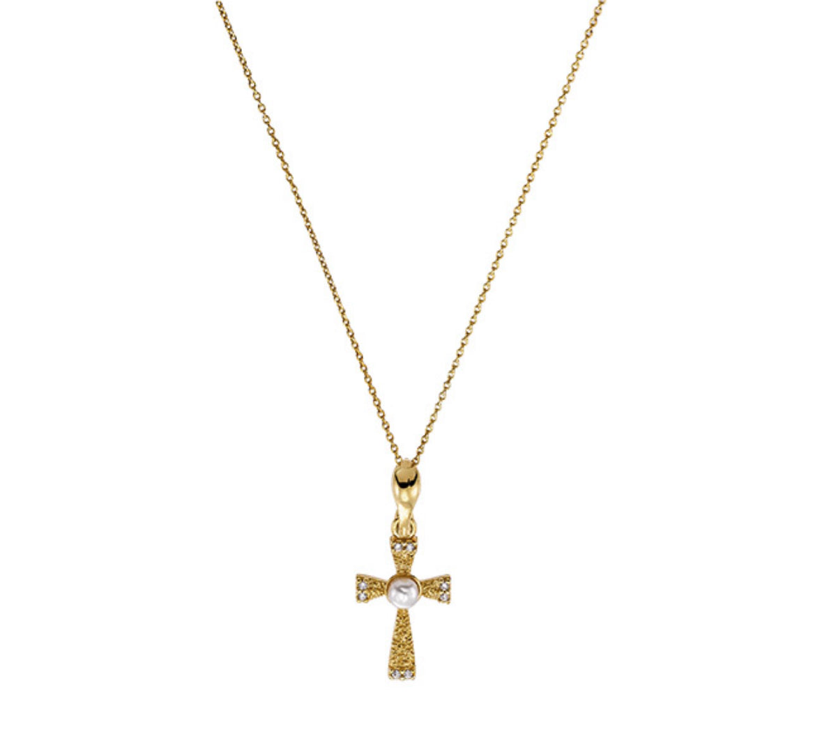 Κομψό και διαχρονικό κολιέ με σταυρό από ασήμι 925 επιχρυσωμένο, διακοσμημένο με λευκό μαργαριτάρι στο κέντρο και λαμπερά ζιργκόν στις άκρες. Ο συνδυασμός χρυσού, μαργαριταριού και κρυστάλλων χαρίζει στο κόσμημα ιδιαίτερη φινέτσα.