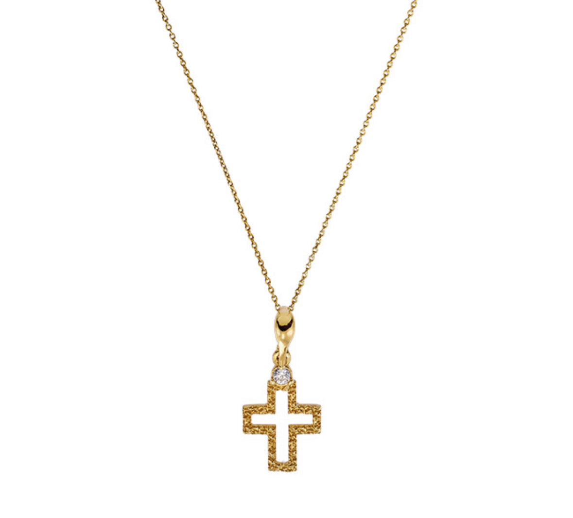Ένα κομψό και διακριτικό κολιέ με σταυρό από ασήμι 925 επιχρυσωμένο. Ο σταυρός έχει ιδιαίτερη υφή που τονίζει το σχέδιο, ενώ στο επάνω μέρος κοσμείται από ένα λαμπερό λευκό ζιργκόν, χαρίζοντας φως και κομψότητα.