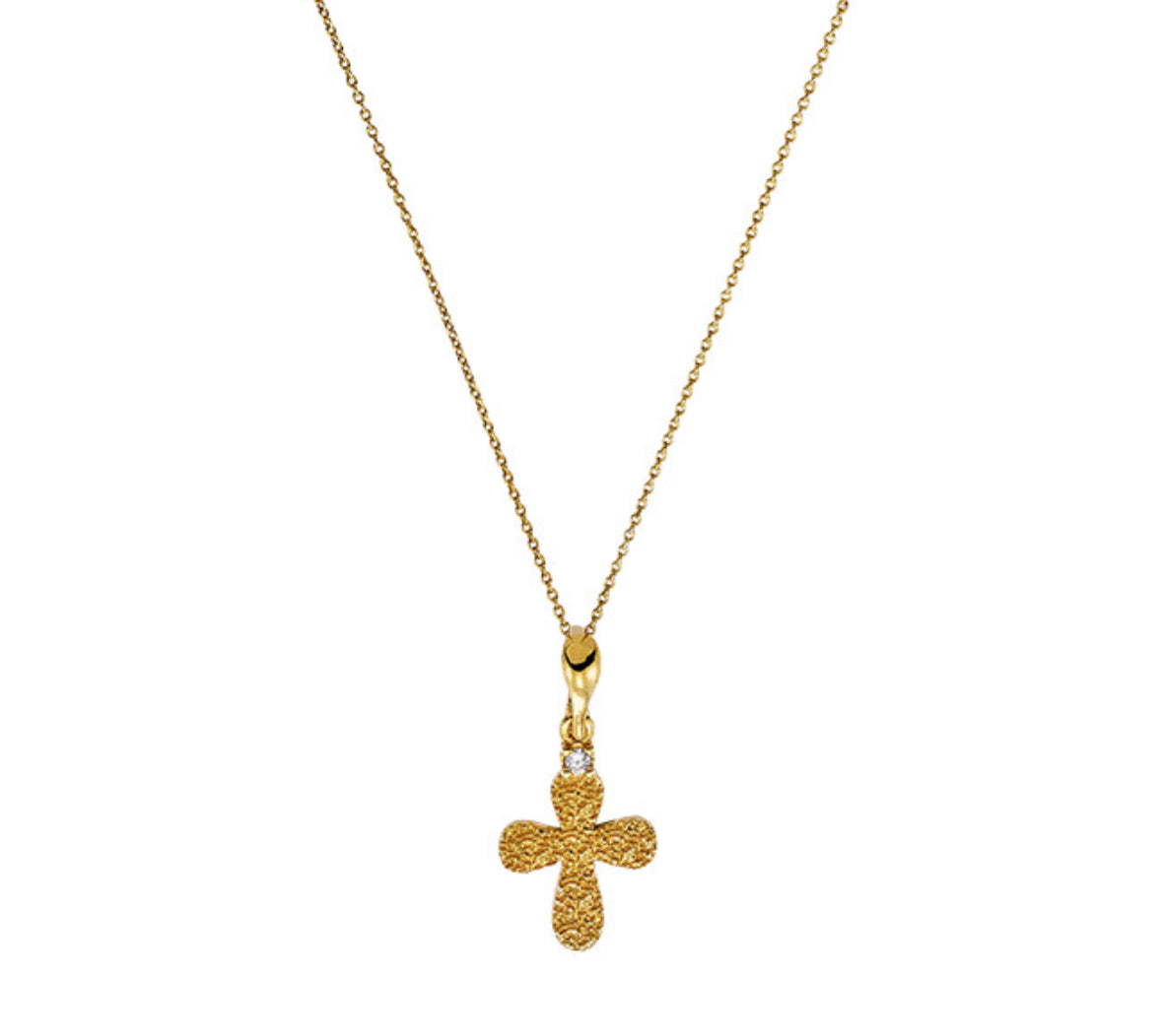 Ένα κομψό και διακριτικό κολιέ με σταυρό από ασήμι 925 επιχρυσωμένο, διακοσμημένο με ένα λαμπερό ζιργκόν στο πάνω μέρος. Το ιδιαίτερο σφυρήλατο φινίρισμα του σταυρού δίνει μοντέρνα αλλά και διαχρονική αίσθηση, ιδανικό για καθημερινή χρήση ή για δώρο.