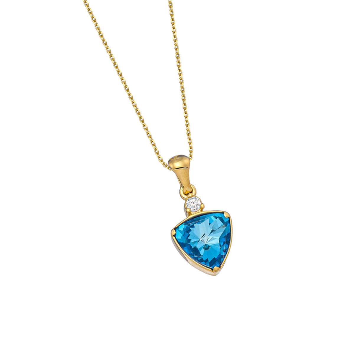 Ένα εκλεπτυσμένο κολιέ από ασήμι 925 επιχρυσωμένο, που συνδυάζει την πολυτέλεια με τον μοντέρνο σχεδιασμό. Το μενταγιόν κοσμείται με τριγωνικό μπλε κρύσταλλο σε λαμπερή κοπή, ενώ στο επάνω μέρος του δεσπόζει ένα μικρό λευκό ζιργκόν που ολοκληρώνει την κομψή του εμφάνιση.