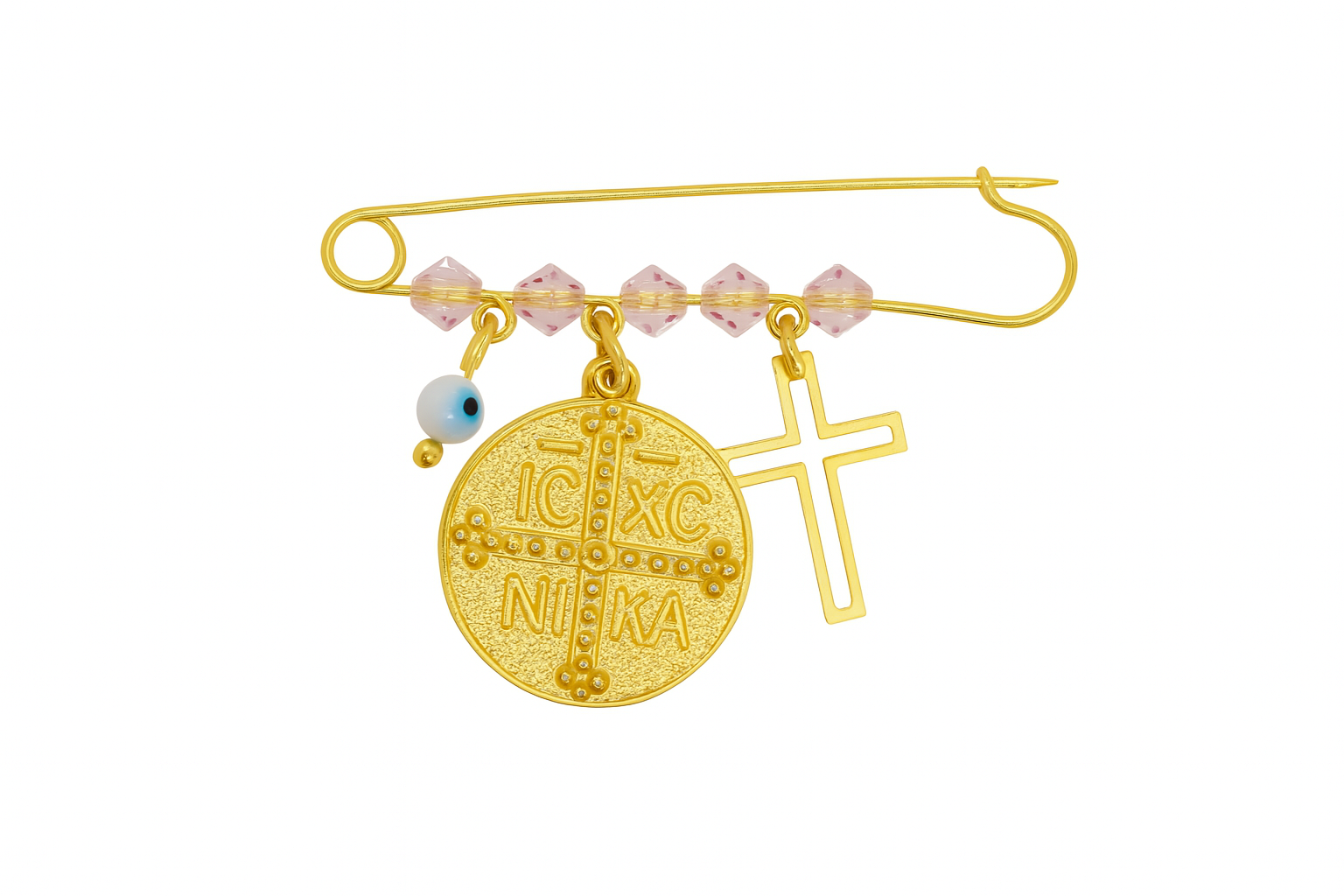 Κομψή και ρομαντική παραμάνα από επιχρυσωμένο ασήμι 925, ιδανική για νεογέννητο κοριτσάκι. Διαθέτει Κωνσταντινάτο με IC XC NI KA, ροζ κρυστάλλινες χάντρες, ματάκι προστασίας και έναν διακριτικό σταυρό. Ένα μοναδικό δώρο για βάπτιση ή γέννηση που συνδυάζει την παράδοση με τη φινέτσα.