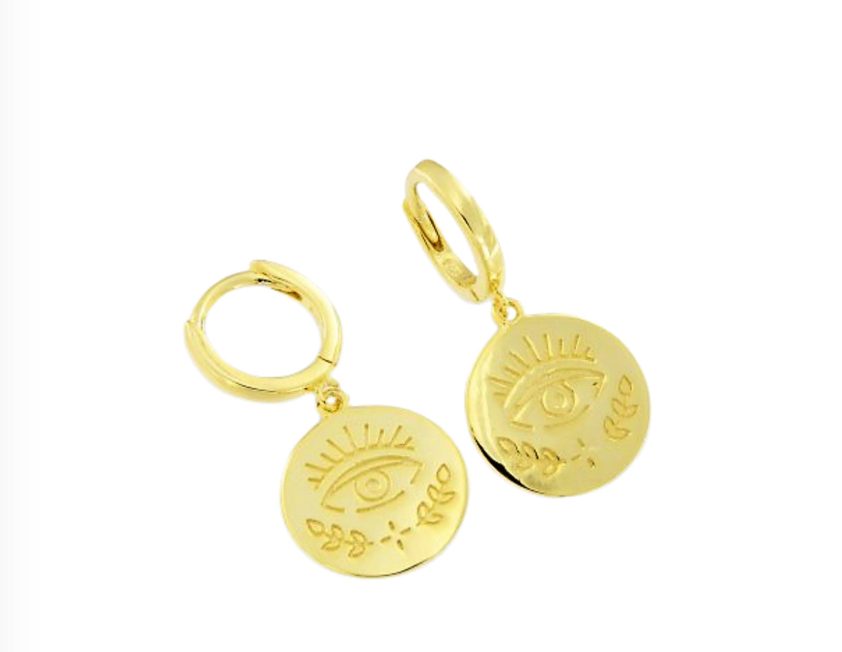 Δώστε έναν συμβολικό και μοντέρνο τόνο στο στυλ σας με αυτά τα ασημένια επιχρυσωμένα σκουλαρίκια. Οι διακριτικοί χρυσοί κρίκοι συνοδεύονται από στρογγυλά μοτίφ με ανάγλυφη χάραξη του ματιού – ένα διαχρονικό σύμβολο προστασίας και θετικής ενέργειας.