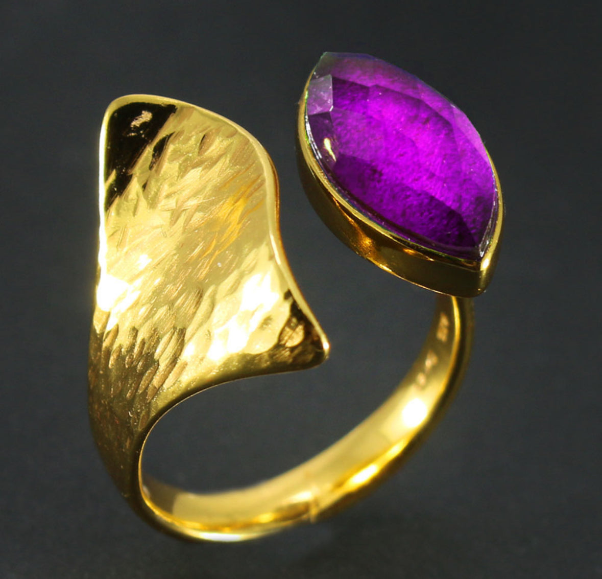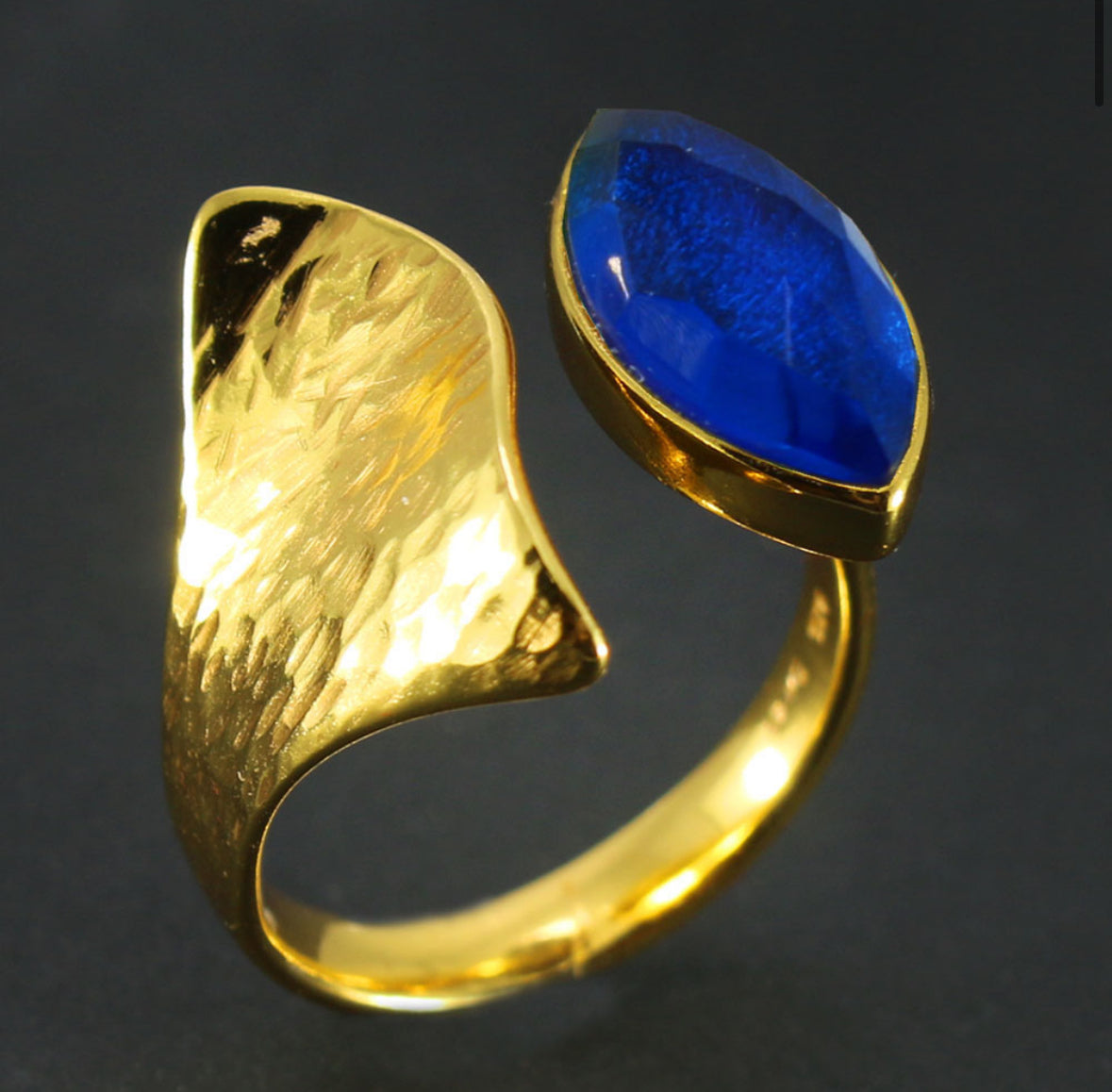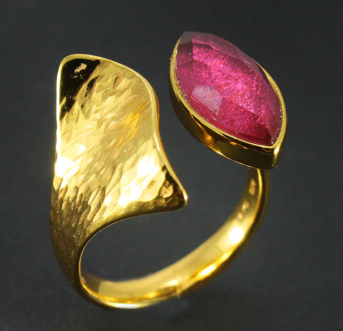 Εντυπωσιακό δαχτυλίδι από επιχρυσωμένο ασήμι 925 με φυσική πέτρα σε κοπή μαρκίζ. Ο συνδυασμός της ζωηρής πέτρας με τη χρυσή λάμψη του μετάλλου δημιουργεί ένα εκλεπτυσμένο και δυναμικό κόσμημα. Το ανοιχτό του σχέδιο προσδίδει μοντέρνα αισθητική και άνετη εφαρμογή, ιδανική για καθημερινή ή βραδινή εμφάνιση.