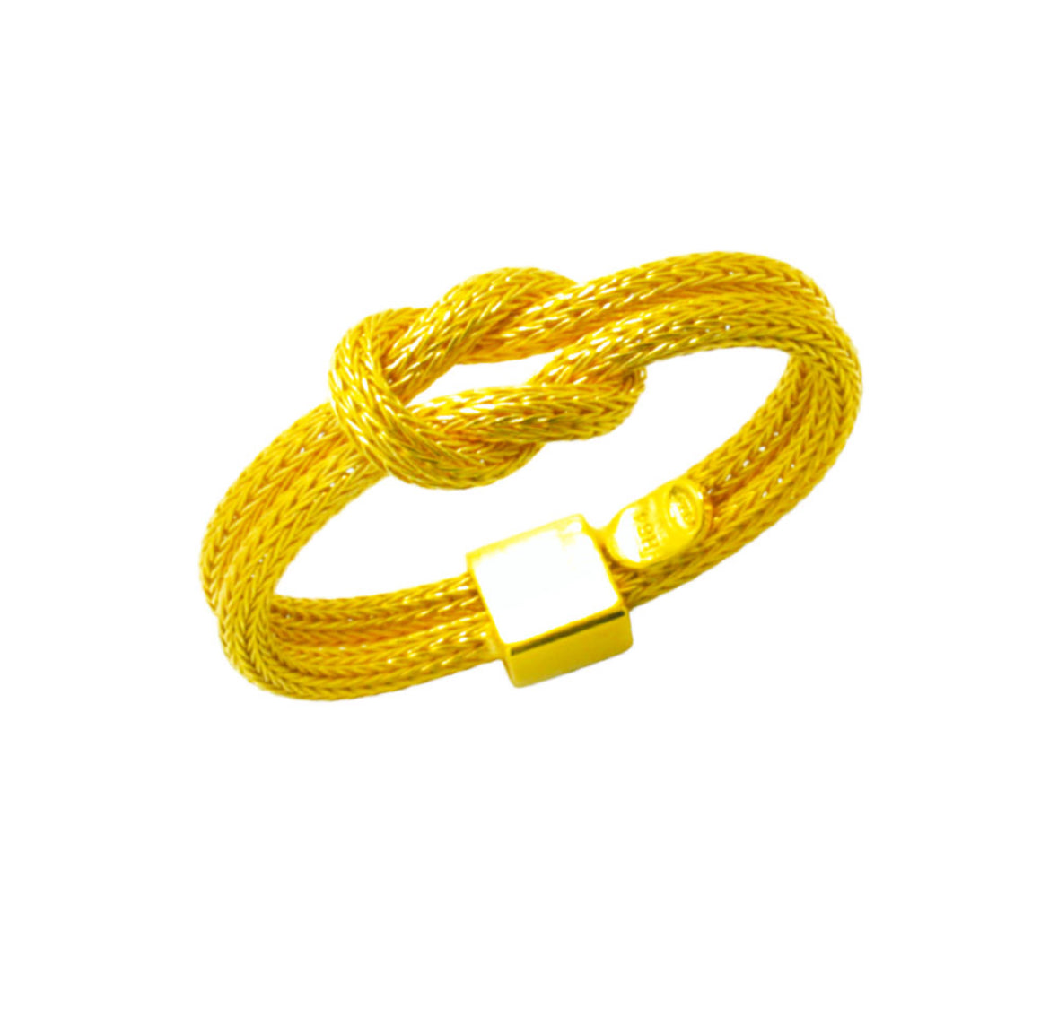 Κομψό και διαχρονικό βραχιόλι από ασήμι 925, επιχρυσωμένο με 24 καράτια, με σχέδιο κόμπου που συμβολίζει τη δύναμη, τη σύνδεση και την αιώνια ένωση. Η πλέξη του μετάλλου δίνει στο κόσμημα υφή και όγκο, διατηρώντας παράλληλα μια εκλεπτυσμένη αισθητική. Ιδανικό για να φορεθεί μόνο του ή συνδυαστικά με άλλα βραχιόλια.