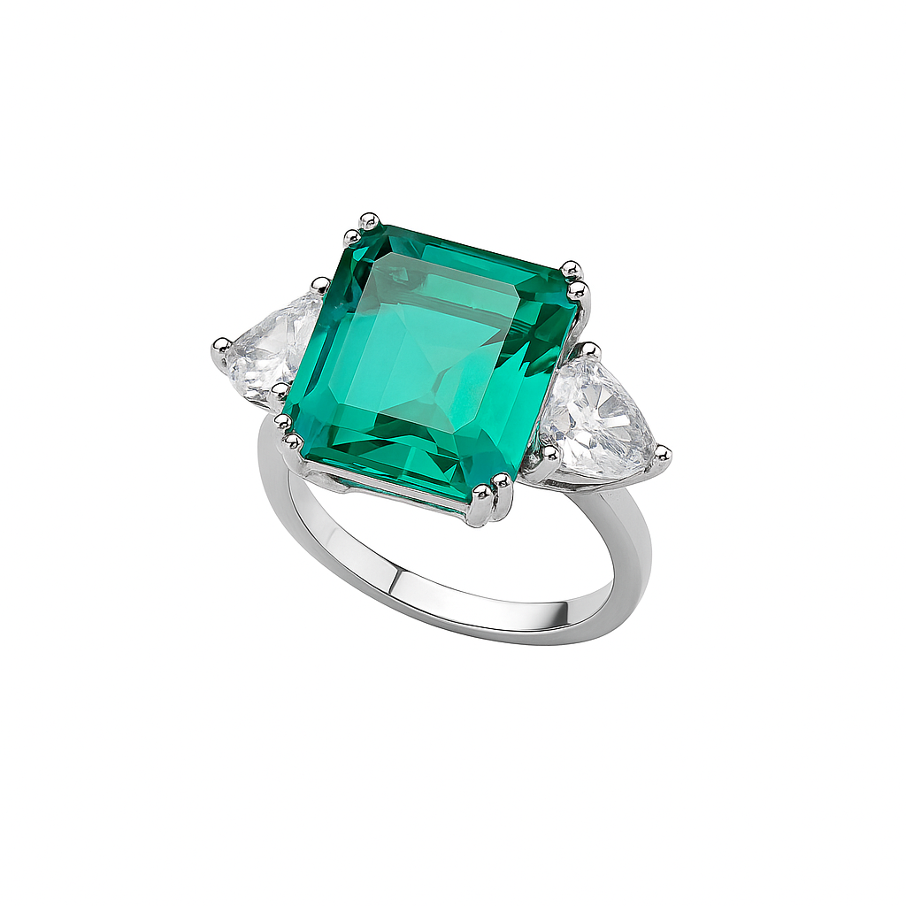 Ασημένιο δαχτυλίδι με ορθογώνια πέτρα σε ανοιχτό σμαραγδί χρώμα που μαγνητίζει το βλέμμα. Η κεντρική πέτρα αναδεικνύεται με διαυγείς, λευκές πέτρες δεξιά και αριστερά, δημιουργώντας μια κομψή και αρμονική σύνθεση.