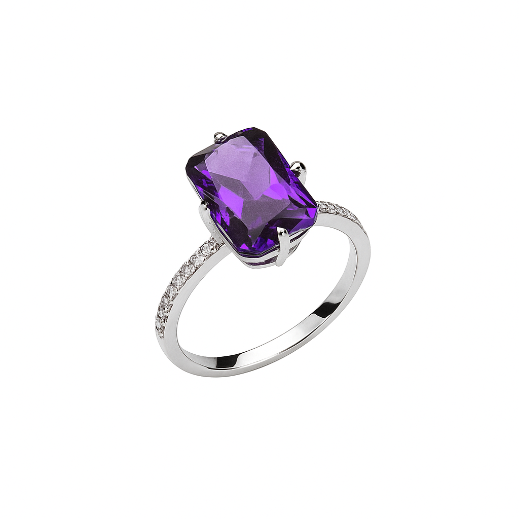 Αναδείξτε το στυλ και την κομψότητά σας με αυτό το εντυπωσιακό δαχτυλίδι. Η ορθογώνια μοβ πέτρα ζιργκόν στο κέντρο μαγνητίζει τα βλέμματα με τη βαθιά μοβ λάμψη της, ενώ το πλαίσιο και η βάση του είναι διακοσμημένα με λαμπερά λευκά ζιργκόν, προσδίδοντας πολυτέλεια και λάμψη σε κάθε κίνηση.