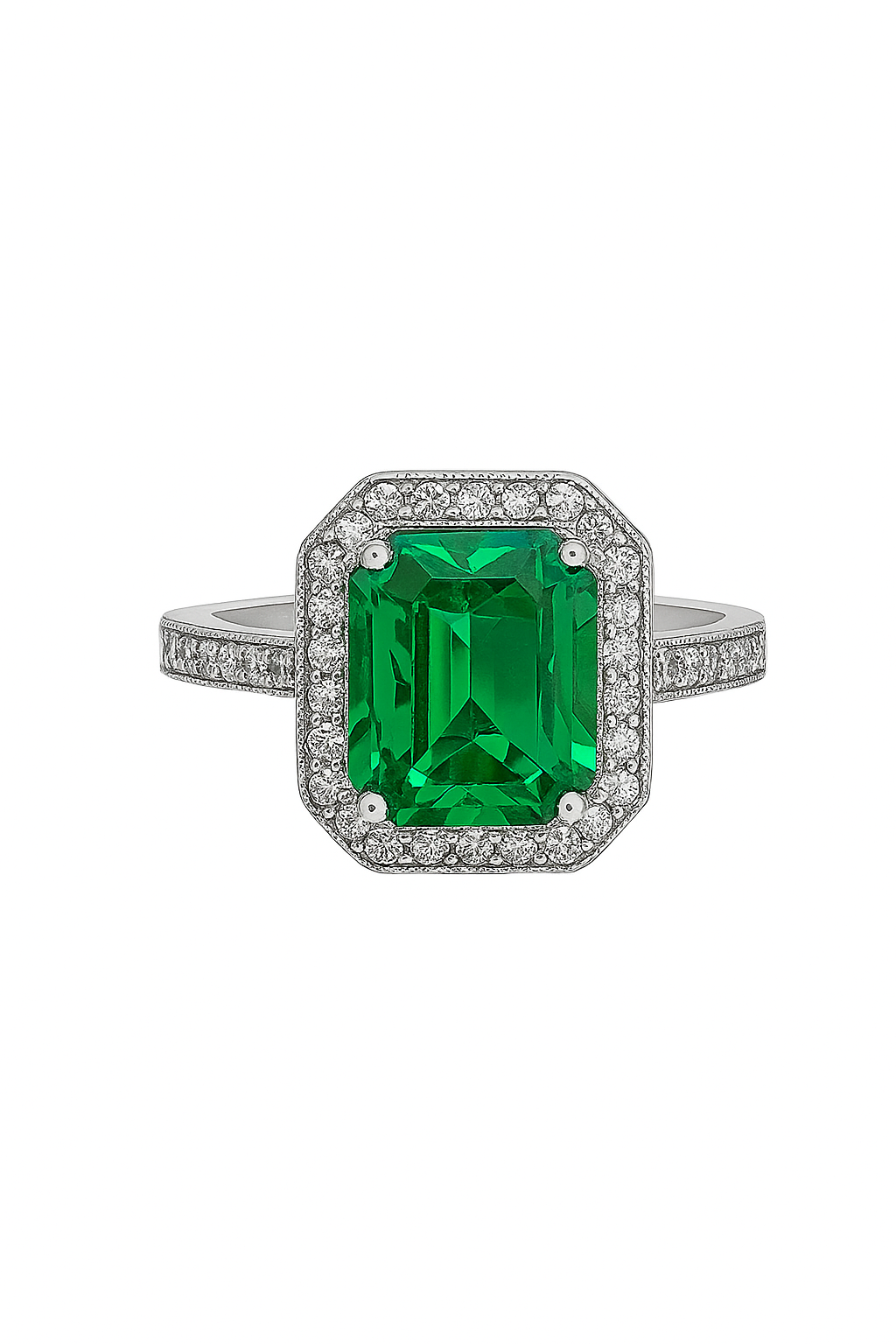 Αναδείξτε το στυλ και την κομψότητά σας με αυτό το εντυπωσιακό δαχτυλίδι. Η ορθογώνια σμαραγδένια πέτρα στο κέντρο μαγνητίζει τα βλέμματα με τη βαθιά πράσινη λάμψη της, ενώ το πλαίσιο και η βάση του είναι διακοσμημένα με λαμπερά λευκά ζιργκόν, προσδίδοντας πολυτέλεια και λάμψη σε κάθε κίνηση.
