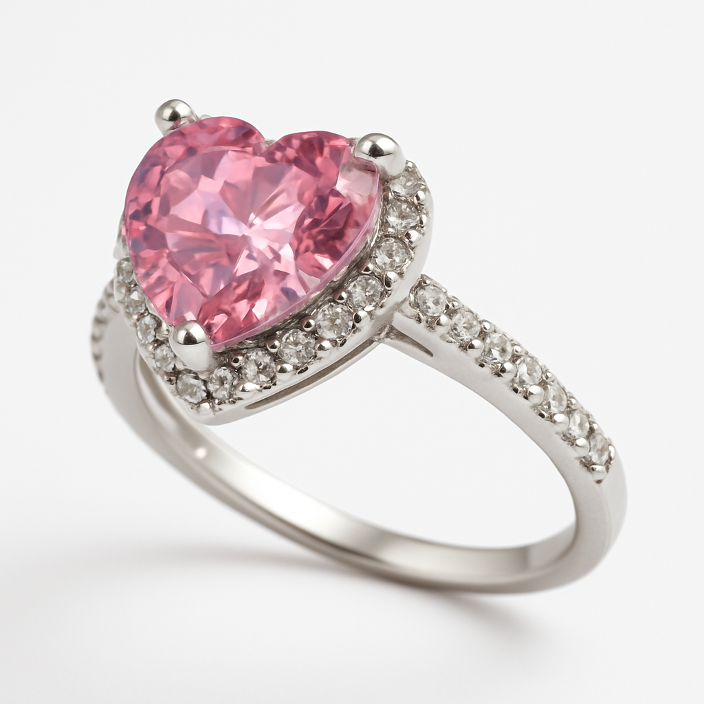 Αναδείξτε την κομψότητα και τη θηλυκότητά σας με αυτό το εντυπωσιακό δαχτυλίδι, διακοσμημένο με μια υπέροχη καρδιά σε ροζ απόχρωση στο κέντρο.