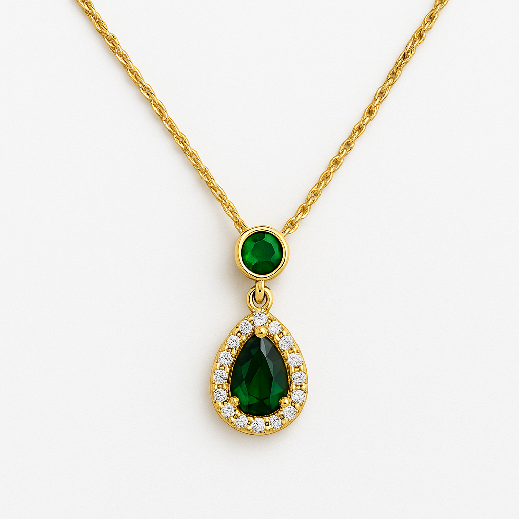 Αυτό το εκλεπτυσμένο κολιέ συνδυάζει κομψότητα, λάμψη και διαχρονικό στιλ. Κατασκευασμένο από Ασήμι 925 επιχρυσωμένο. Το κεντρικό στοιχείο του κοσμήματος είναι μια βαθύ πράσινη πέτρα σε σχήμα δακρύου, κομμένη έτσι ώστε να αντανακλά υπέροχα το φως. Την πλαισιώνουν λαμπερά λευκά ζιργκόν, δημιουργώντας μια εντυπωσιακή αντίθεση που κάνει το κολιέ να ξεχωρίζει ακόμη και από μακριά.