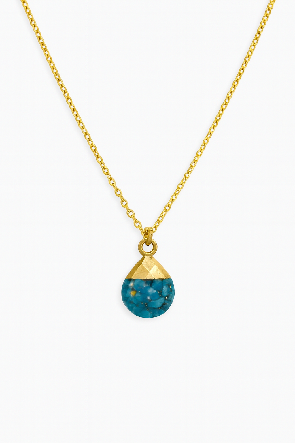 Minimal και κομψό κολιέ 925 με χρυσή αλυσίδα και μενταγιόν σε σχήμα δάκρυ. Το μενταγιόν συνδυάζει την πολυτέλεια του χρυσού με την έντονη απόχρωση του τυρκουάζ λίθου, δημιουργώντας ένα εντυπωσιακό και διαχρονικό κόσμημα. Η χρυσή επένδυση στο επάνω μέρος του λίθου αναδεικνύει ακόμα περισσότερο τη φυσική ομορφιά και τις αποχρώσεις του τυρκουάζ.