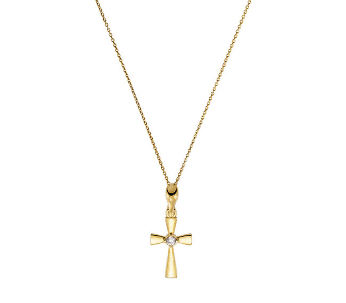 Μινιμαλιστικό και κομψό κολιέ με σταυρό από ασήμι 925, επιχρυσωμένο με λαμπερό χρυσό. Στο κέντρο του σταυρού ξεχωρίζει ένα λευκό ζιργκόν, που προσθέτει λάμψη και διακριτική πολυτέλεια.