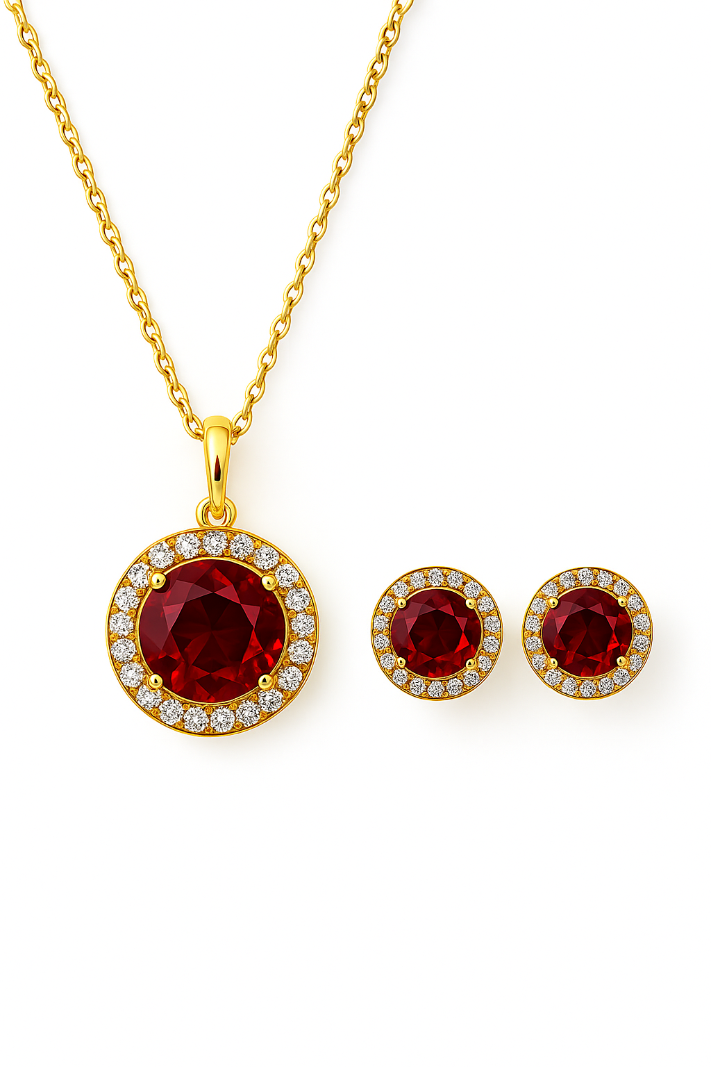 Αναδείξτε τη θηλυκότητα και την κομψότητά σας με αυτό το εκλεπτυσμένο σετ κοσμημάτων, σχεδιασμένο για να λάμπει σε κάθε περίσταση. Το σετ αποτελείται από εντυπωσιακό κολιέ και αντίστοιχα καρφωτά σκουλαρίκια, διακοσμημένα με λαμπερή κεντρική πέτρα σε βαθύ κόκκινο χρώμα αγκαλιασμένη από μία πολυτελή στεφάνη μικροσκοπικών λευκών ζιργκόν.