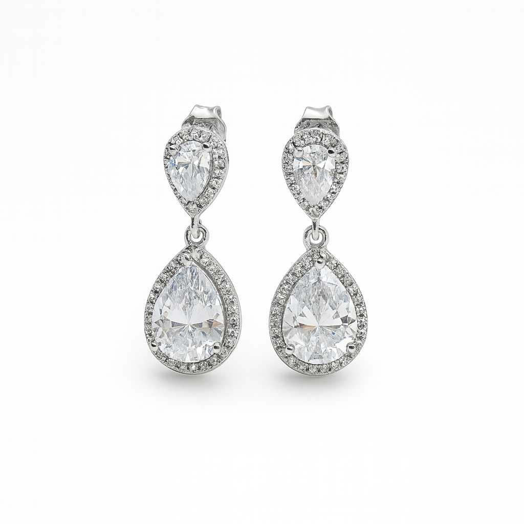 Λαμπερά και εκλεπτυσμένα, αυτά τα χειροποίητα σκουλαρίκια από ασήμι 925 κοσμούνται με εντυπωσιακές πέτρες ζιργκόν σε κοπή δάκρυ, περιμετρικά διακοσμημένες με μικρότερα ζιργκόν για επιπλέον λάμψη. Ο διαχρονικός σχεδιασμός τους τα καθιστά ιδανική επιλογή για βραδινές εμφανίσεις ή ιδιαίτερες περιστάσεις, προσθέτοντας κομψότητα και πολυτέλεια σε κάθε στυλ.