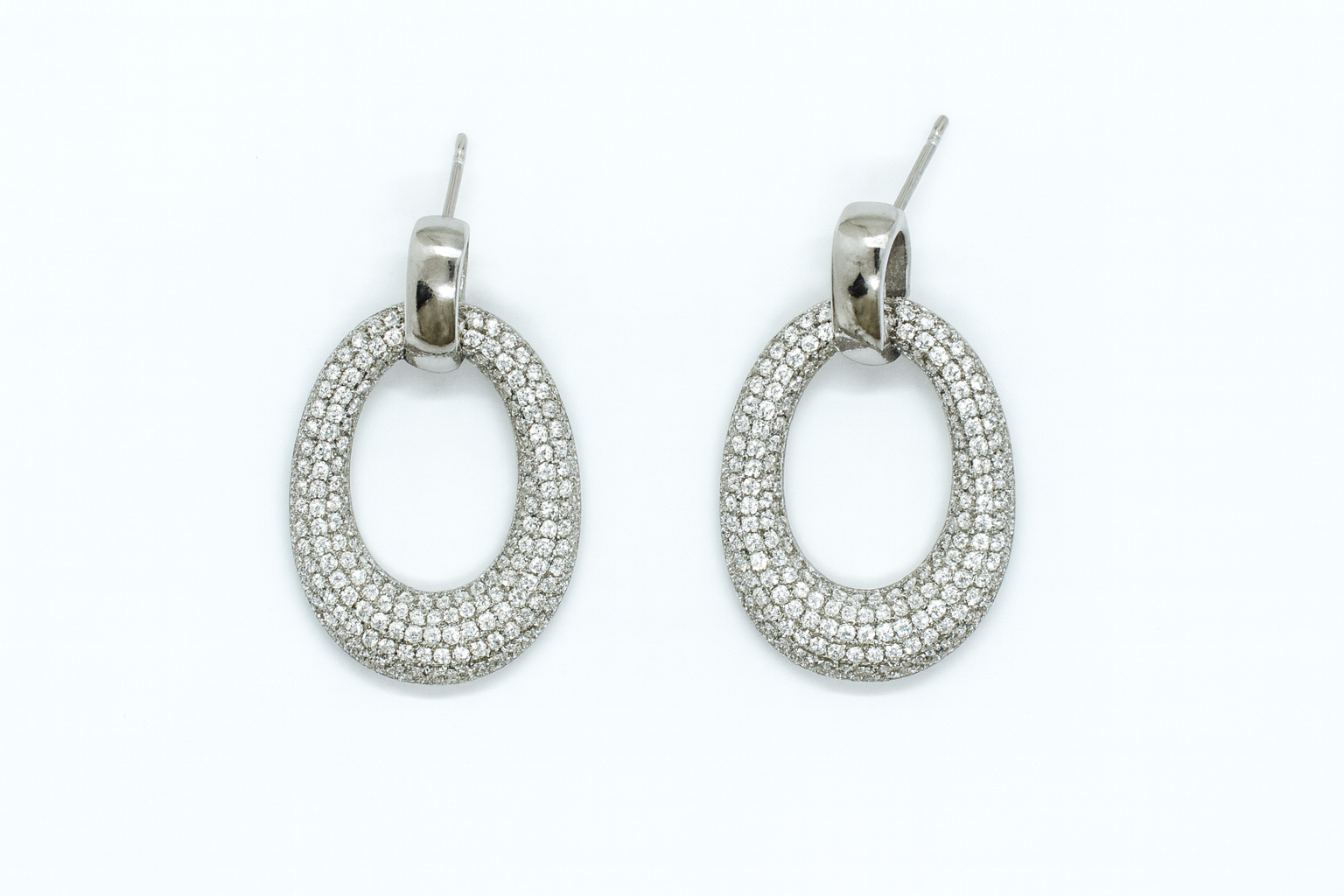 Εντυπωσιακά σκουλαρίκια σε οβάλ σχήμα, διακοσμημένα με λαμπερές λευκές πέτρες ζιργκόν που χαρίζουν εκθαμβωτική λάμψη σε κάθε σας εμφάνιση. Ο κομψός και μοντέρνος σχεδιασμός τους τα καθιστά ιδανικά τόσο για καθημερινές όσο και για βραδινές εμφανίσεις, προσθέτοντας μια πινελιά πολυτέλειας και φινέτσας.
