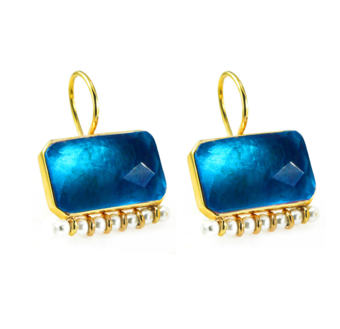 Κομψά χειροποίητα σκουλαρίκια με εντυπωσιακή ορυκτή πέτρα σε ζωηρό μπλε χρώμα και λεπτομέρειες από μαργαριτάρια στη βάση. Το επιχρυσωμένο ασήμι 925 αναδεικνύει τη φυσική λάμψη των λίθων, δημιουργώντας ένα κομψό και μοντέρνο αποτέλεσμα.