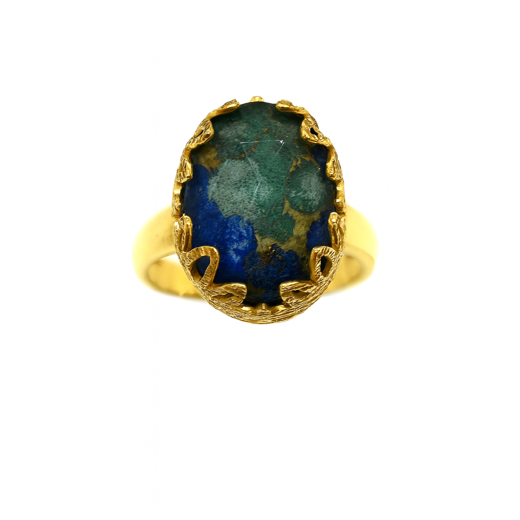 Ανακάλυψε την κομψότητα της φύσης μέσα από αυτό το εντυπωσιακό χειροποίητο δαχτυλίδι της ελληνικής εταιρείας Anastasios Creations. Κατασκευασμένο από επιχρυσωμένο ασήμι 925, το δαχτυλίδι αναδεικνύει μια μοναδική ορυκτή πέτρα αζουρίτη σε αποχρώσεις του μπλε και του πράσινου. Η οργανική κοπή της πέτρας, σε συνδυασμό με τη χειροποίητη λεπτομέρεια στο δέσιμο, δημιουργεί ένα ξεχωριστό κόσμημα με καλλιτεχνική αξία.